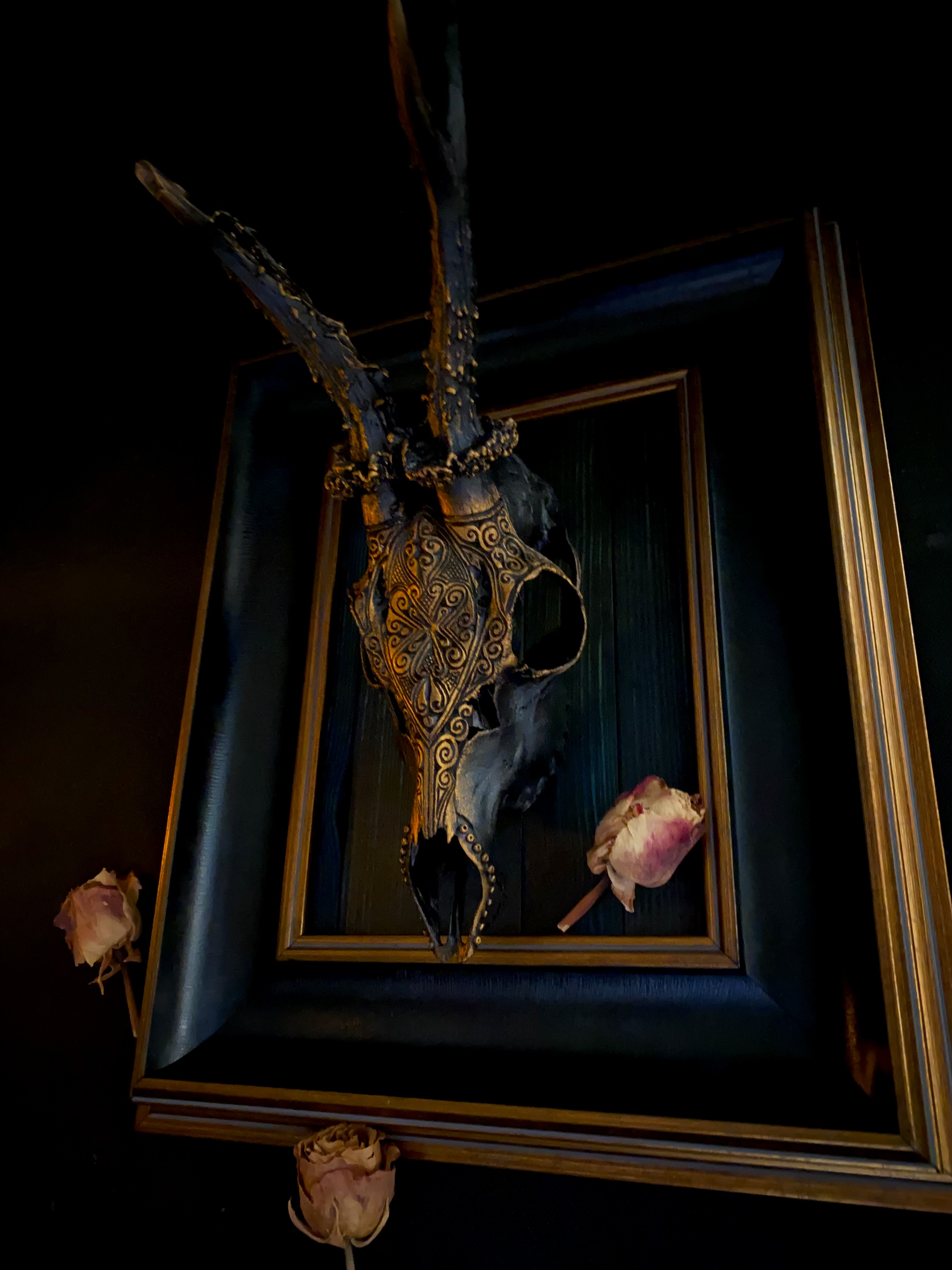 Each piece begins as raw skull and moves through a slow, careful process of stripping, purification, preservation, and pattern carving — then sealed with pigments and patinas that give the finished artwork its timeworn, almost otherworldly presence.
